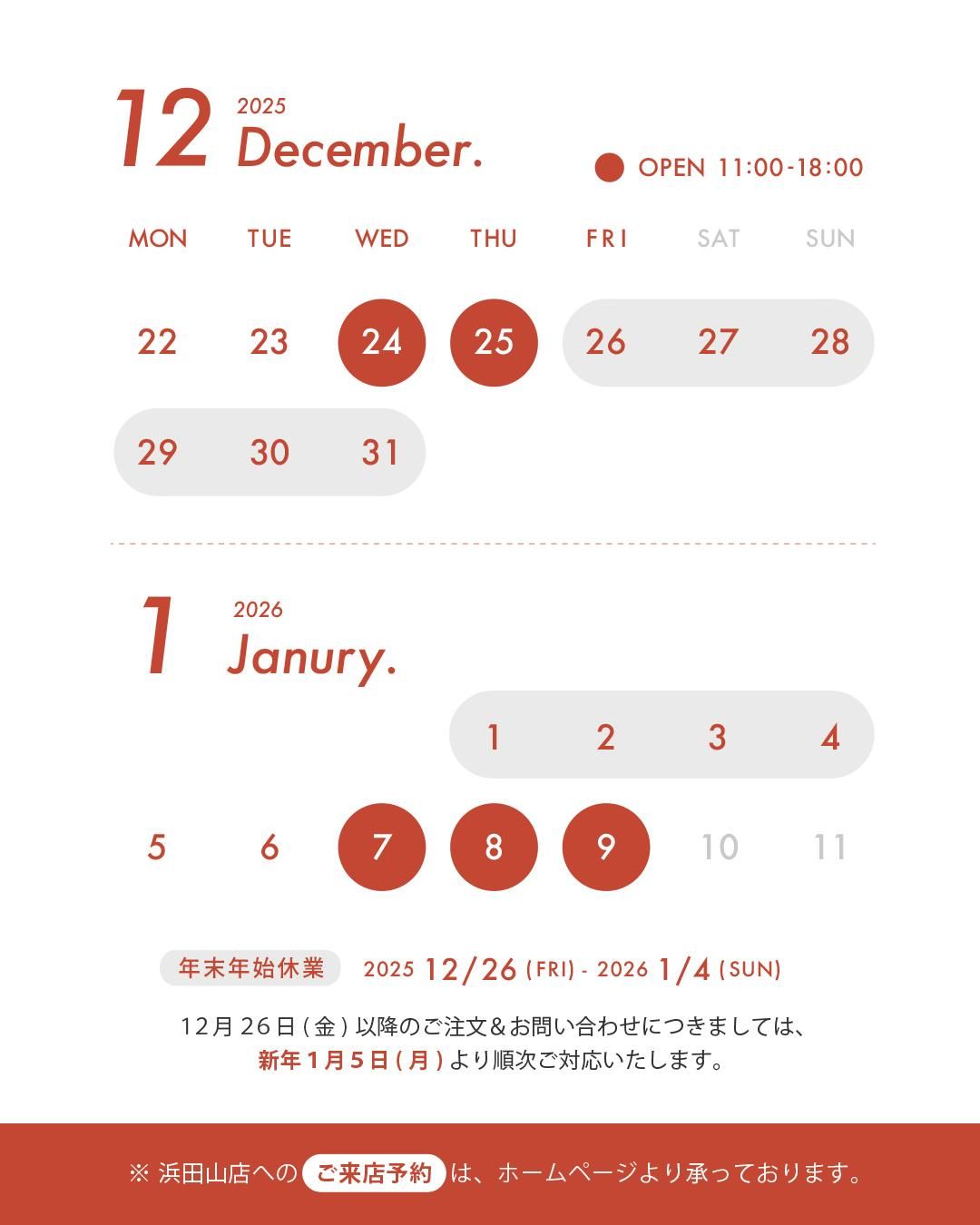 12月26日(金)以降のご注文及びお問い合わせにつきましては、新年1月5日(月)より順次ご対応させて頂きます。